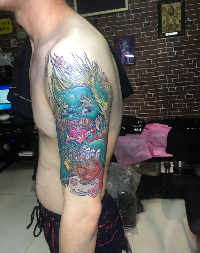 当前位置: 首页 >河北省邢台市纹身店-帝易刺青纹身图案>大臂唐狮纹身图片_新传统纹身图案
