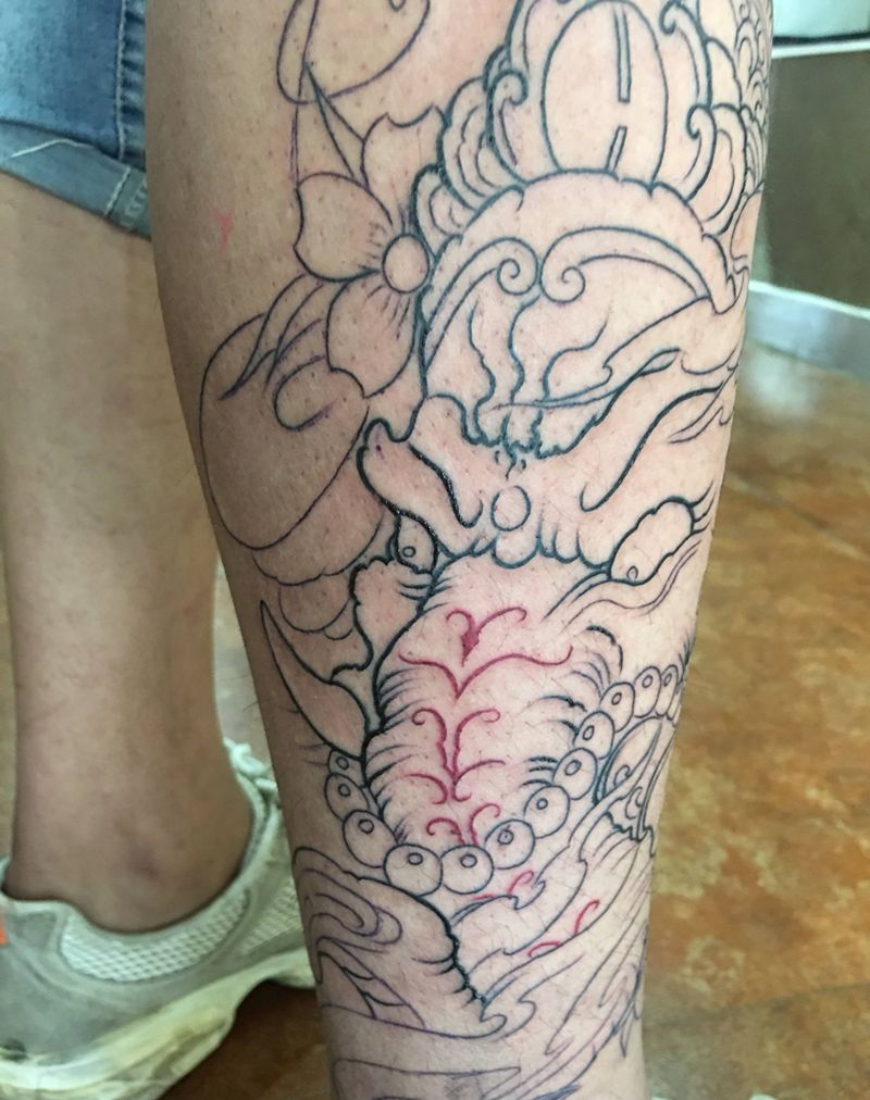 • T网红王老大花腿龙纹身图片_腿部新传统纹身图案
