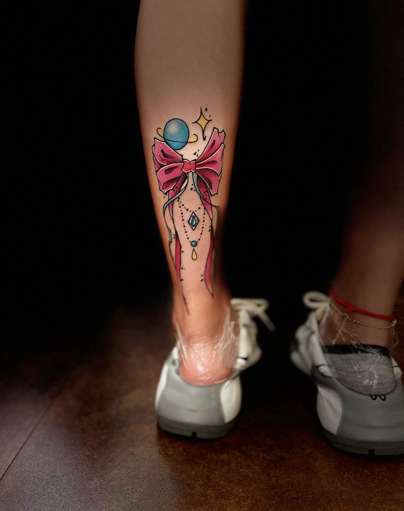 蝴蝶结纹身图片_腿部水彩纹身图案