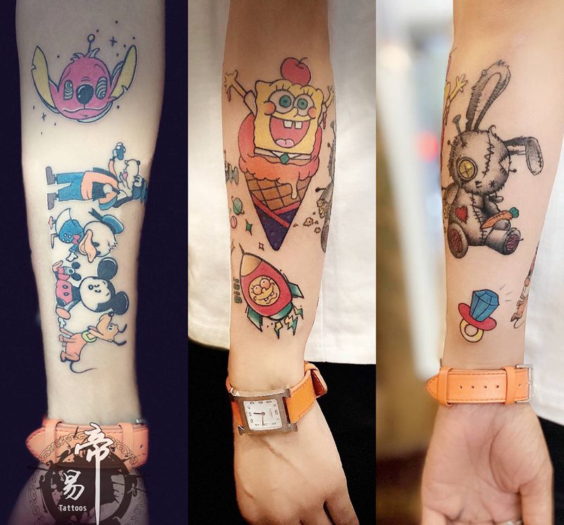 当前位置: 首页 >河北省邢台市纹身店-帝易刺青纹身图案>拼接花臂纹身图片_手臂水彩New School纹身图案