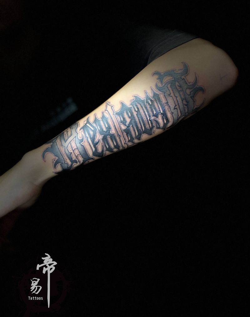 当前位置: 首页 >河北省邢台市纹身店-帝易刺青纹身图案>屠夫纹身图片_手臂花体字纹身图案