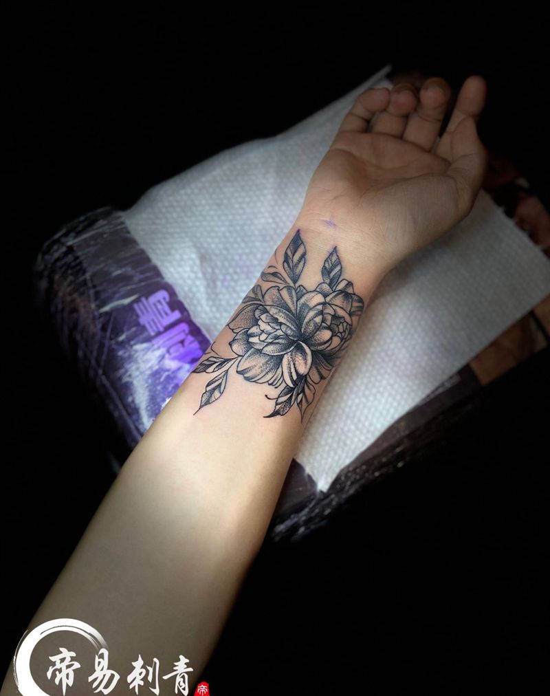 素花遮盖名字纹身图片_手臂点刺纹身图案