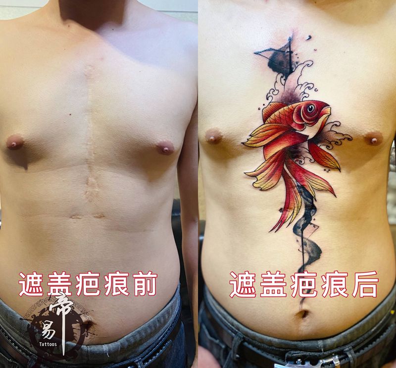 当前位置: 首页 >河北省邢台市纹身店-帝易刺青纹身图案>疤痕遮盖纹身图片_腹部胸部水墨新传统纹身图案