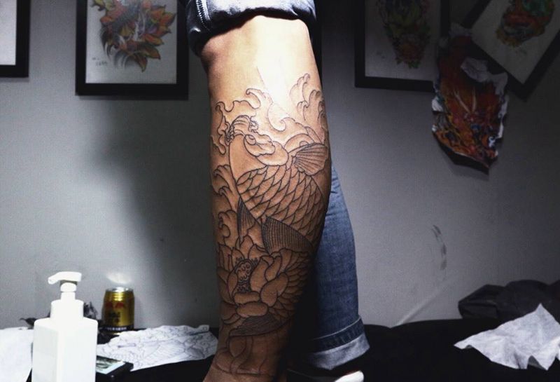 • T网红王老大花腿龙纹身图片_腿部新传统纹身图案