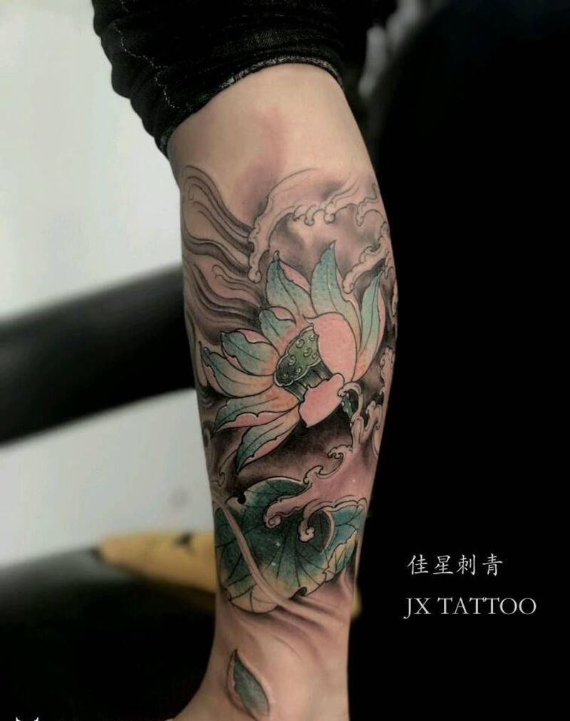 当前位置: 首页 >河北省保定市纹身店-佳星刺青工作室纹身图案>小腿莲花纹身图片