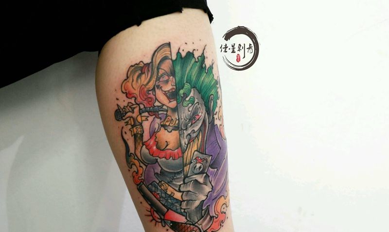 • T包小腿吹火男+阿多福纹身图片_腿部老传统新传统吹火男阿