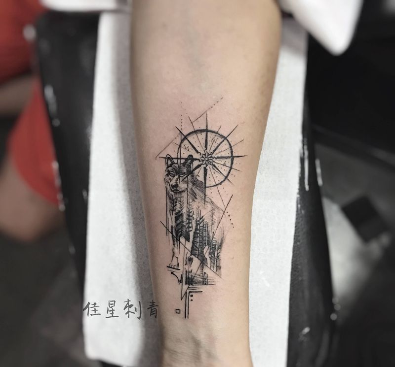 今日工纹身图片_手臂几何点刺狼纹身图案
