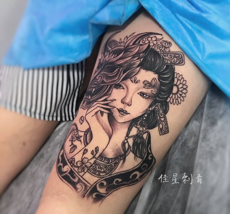 遮盖未完纹身图片_腿部新传统艺妓纹身图案