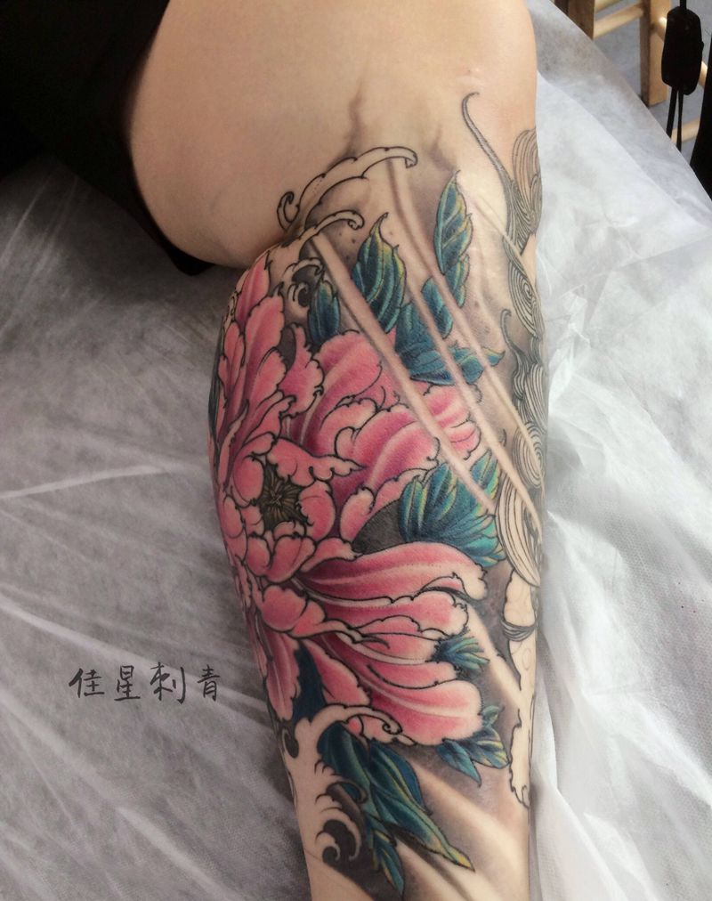当前位置: 首页 >河北省保定市纹身店-佳星刺青工作室纹身图案>包小腿未完纹身图片_腿部新传统花牡丹包小腿纹身图案