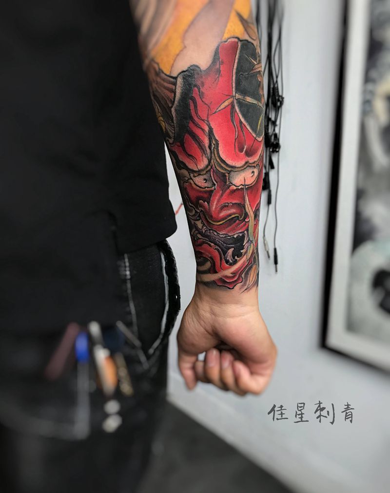 当前位置: 首页 >河北省保定市纹身店-佳星刺青工作室纹身图案>花臂一角纹身图片_手臂新传统般若纹身图案