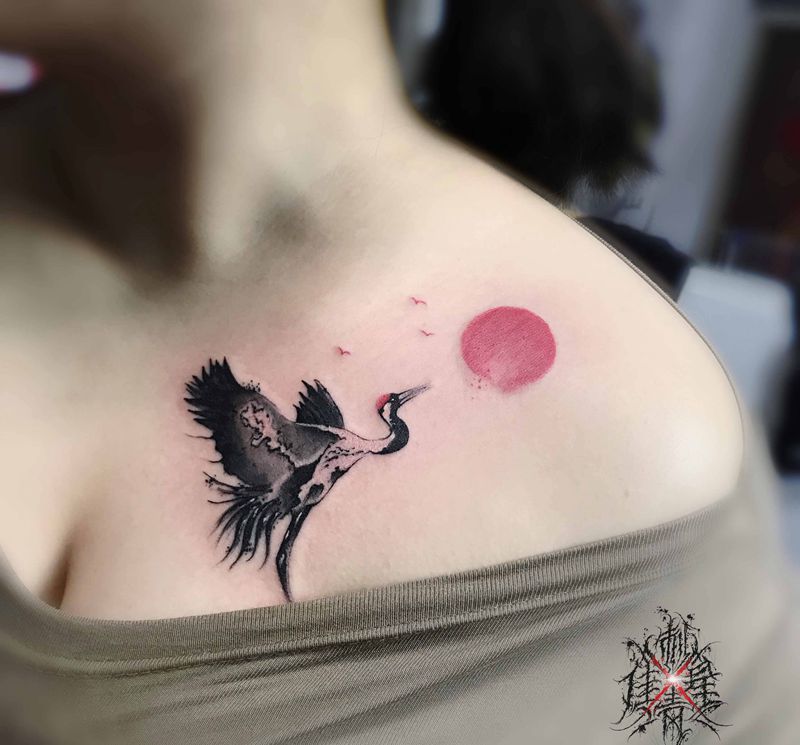 当前位置: 首页 >河北省保定市纹身店-佳星刺青工作室纹身图案>鹤纹身图片_胸部水墨纹身图案