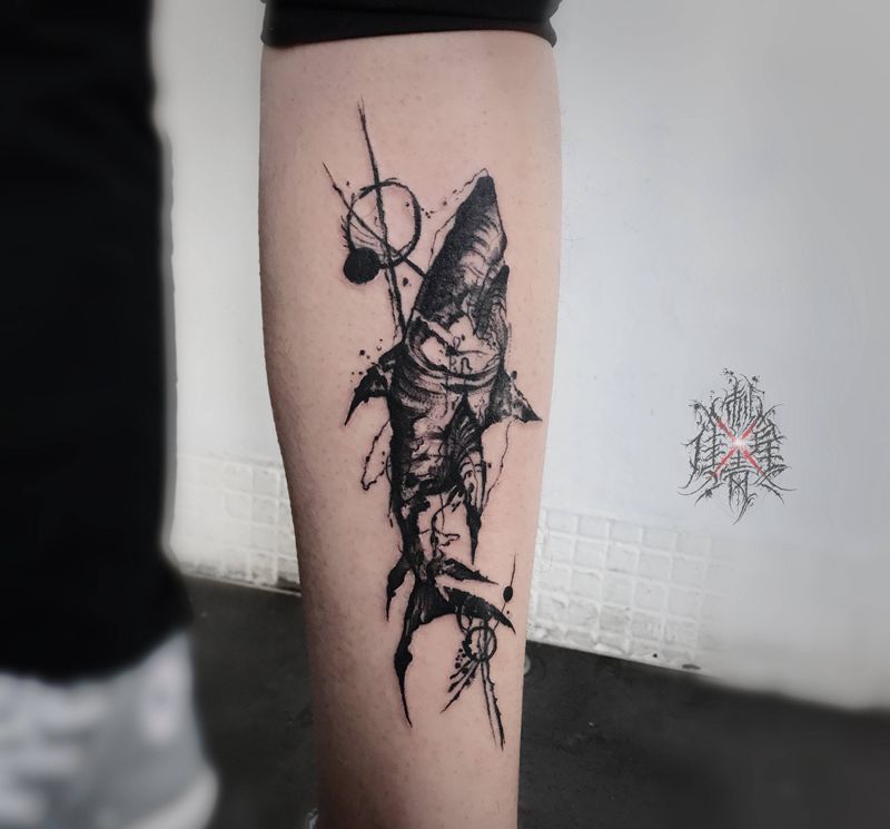 当前位置: 首页 >河北省保定市纹身店-佳星刺青工作室纹身图案>鲨鱼纹身图片_腿部点刺水墨纹身图案