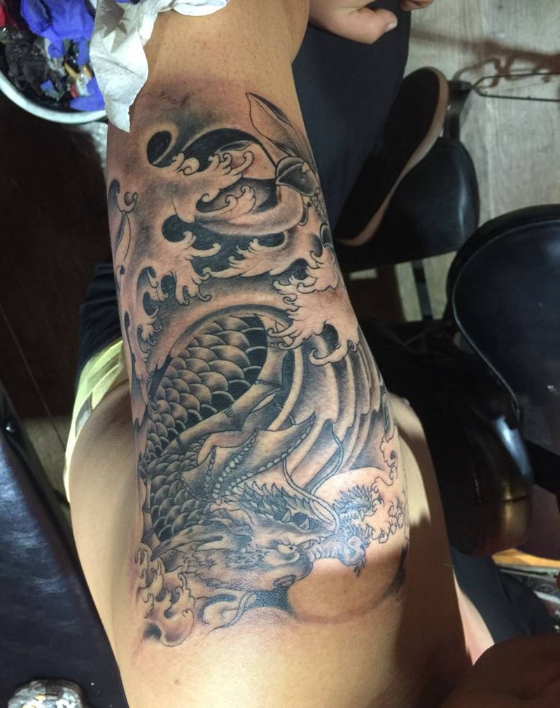 • T网红王老大花腿龙纹身图片_腿部新传统纹身图案