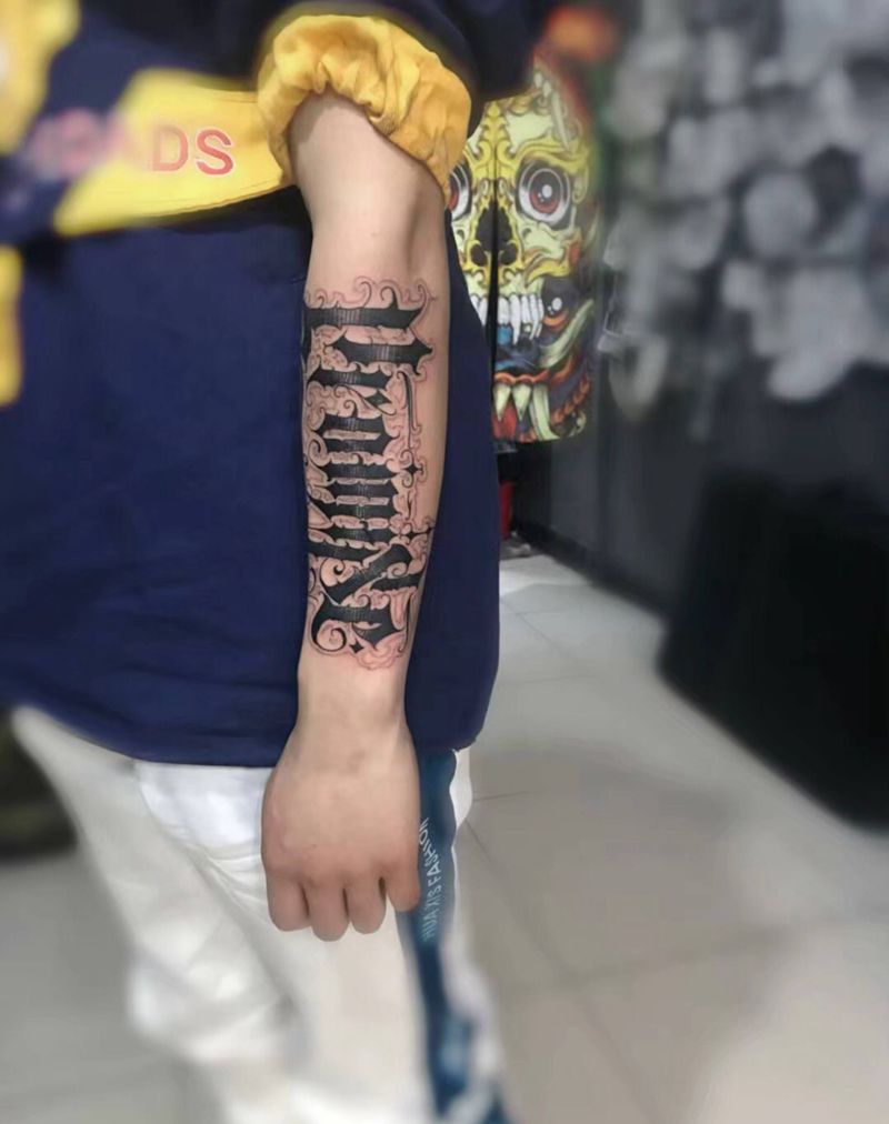 当前位置: 首页 >河北省保定市纹身店-星期八刺青纹身图案>奇卡诺花体字纹身图片_手臂花体字纹身图案