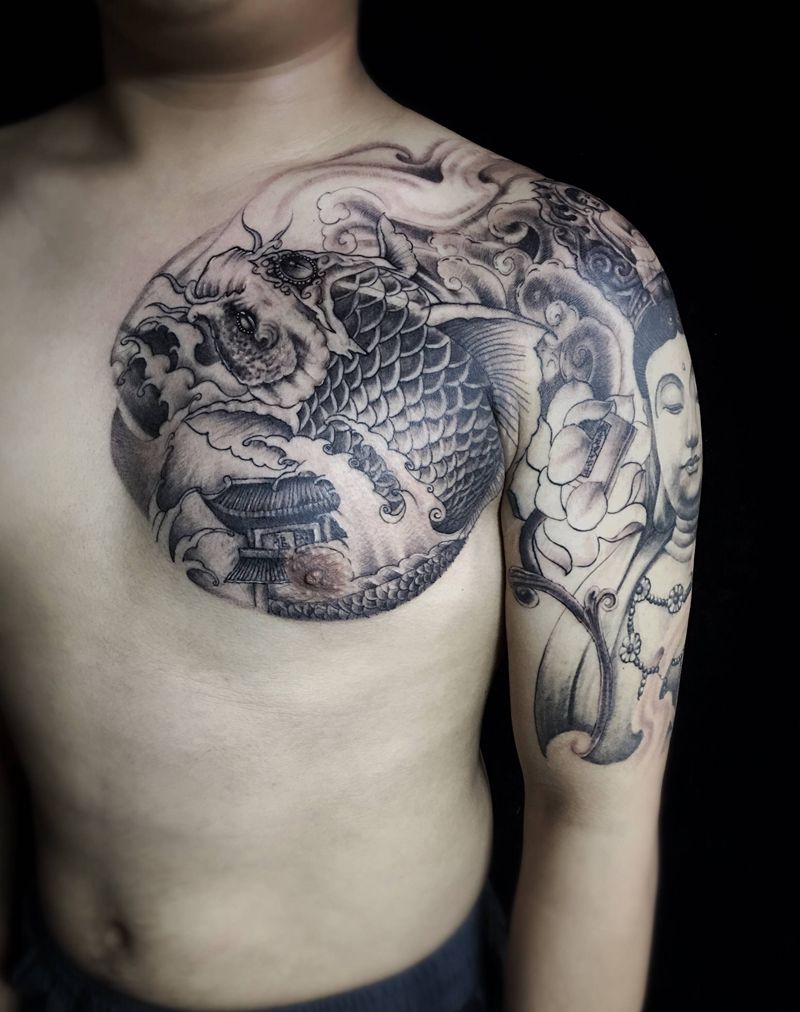 当前位置: 首页 >河北省承德市纹身店-勇航刺青工作室tattoo纹身图案>鲤鱼,锦鲤,佛纹身图片_新传统纹身图案