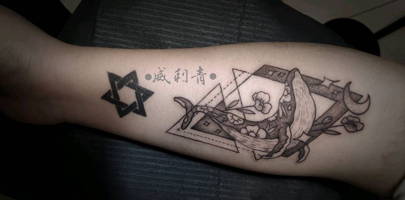 当前位置: 首页 >河北省张家口市纹身店-威刺青纹身图案>海鲸+六芒星纹身图片_手臂几何点刺鲸鱼纹身图案