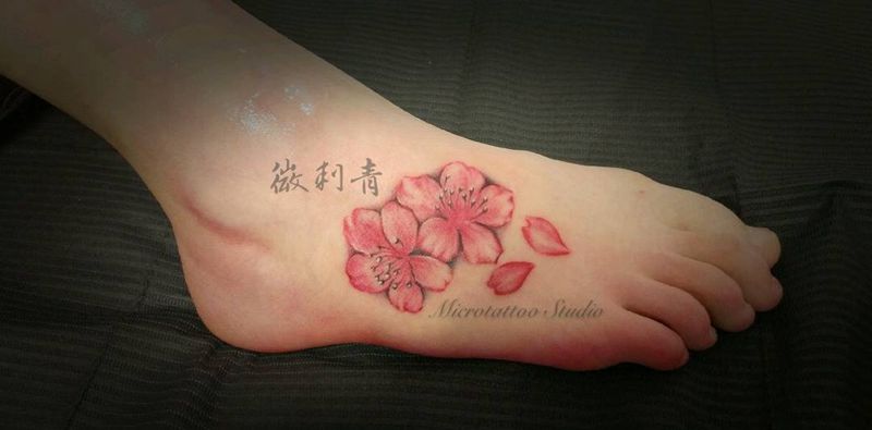 桃花纹身图片_脚部清新植物原创成品纹身图案