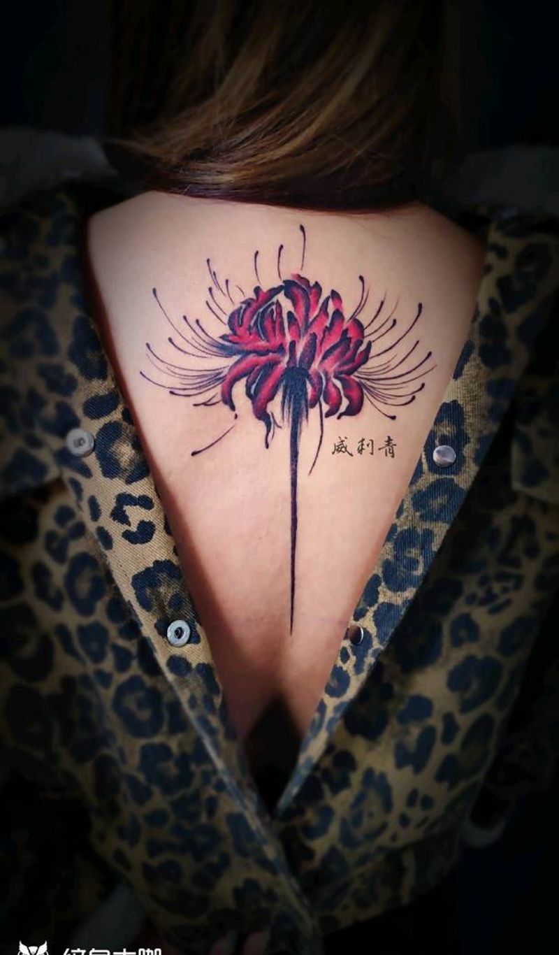 后背曼珠沙华彼岸花纹身图片_背部水墨水彩彼岸花曼珠沙华纹身图案