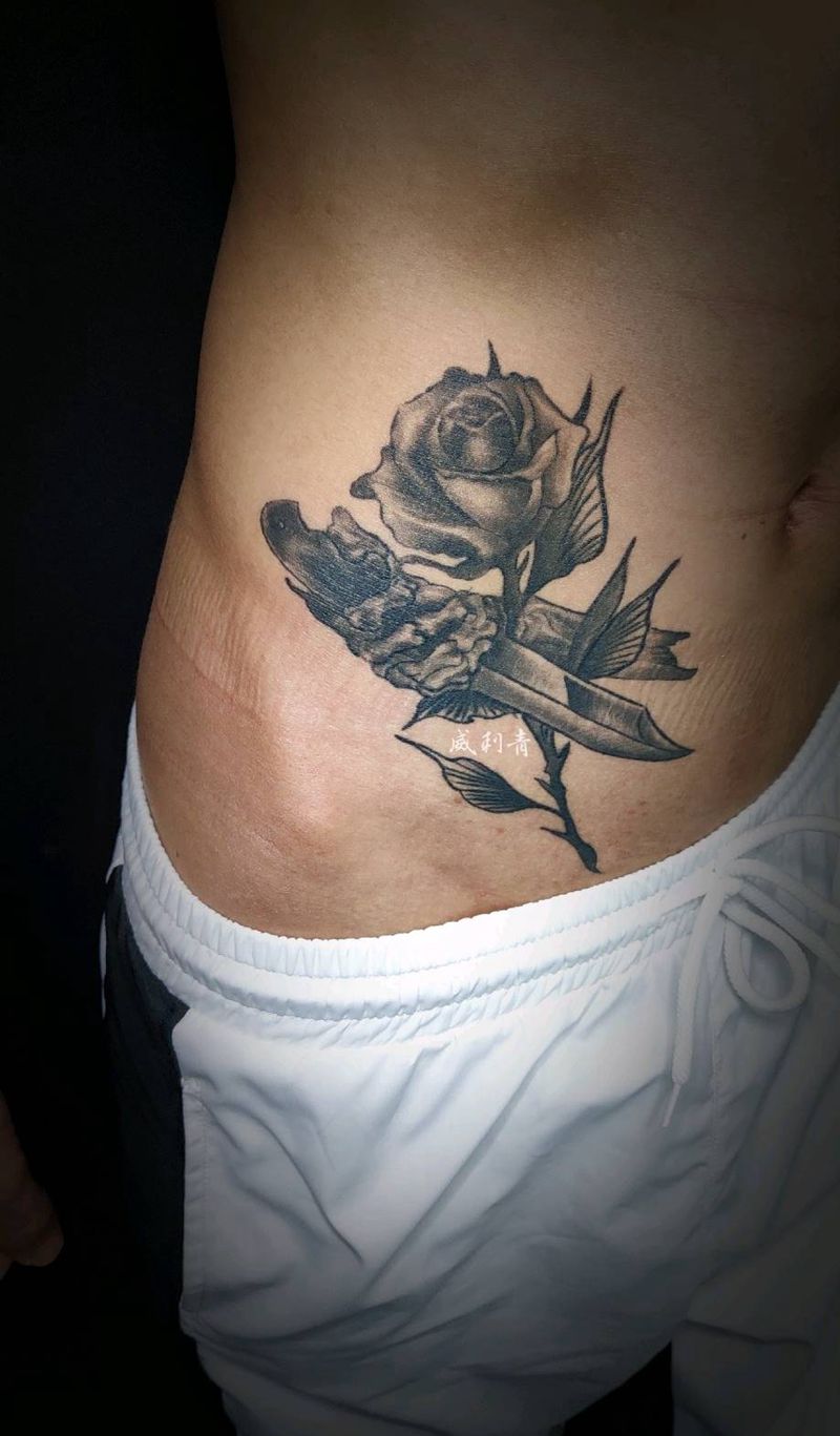 当前位置: 首页 >河北省张家口市纹身店-威刺青纹身图案>守护爱情纹身图片_腰部腹部欧美写实暗黑玫瑰匕首纹身图案