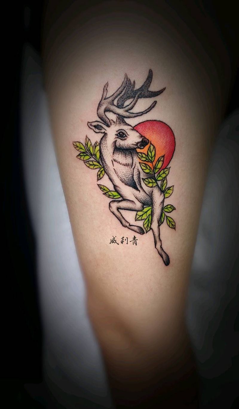 当前位置: 首页 >河北省张家口市纹身店-威刺青纹身图案>鹿纹身图片_手臂点刺鹿植物纹身图案