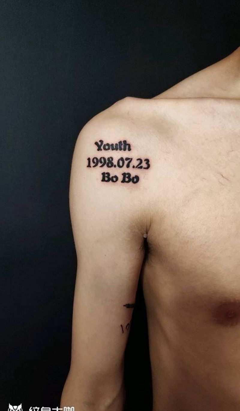 出生证明纹身图片_肩部花体字生日日期英文纹身图案