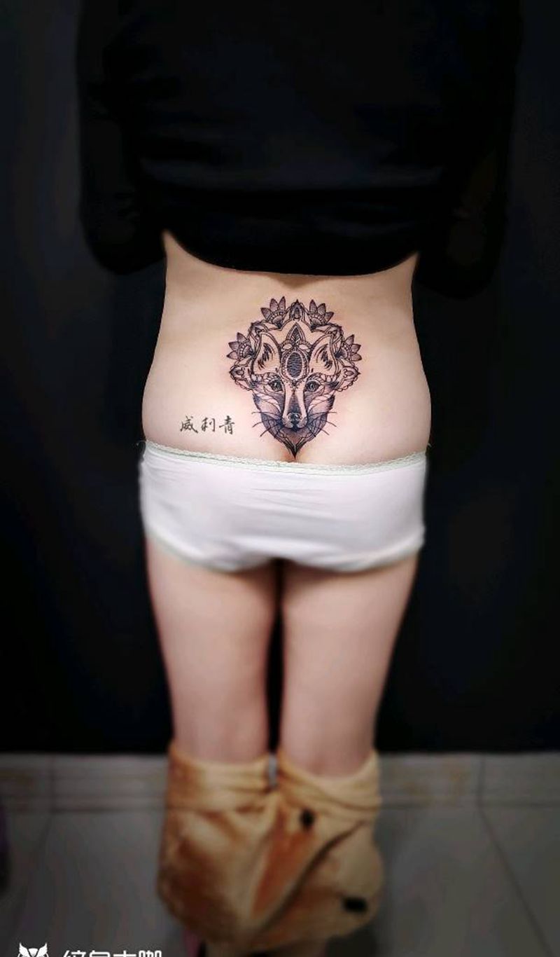 狼图腾纹身图片_腰部点刺图腾线条黑灰纹身图案