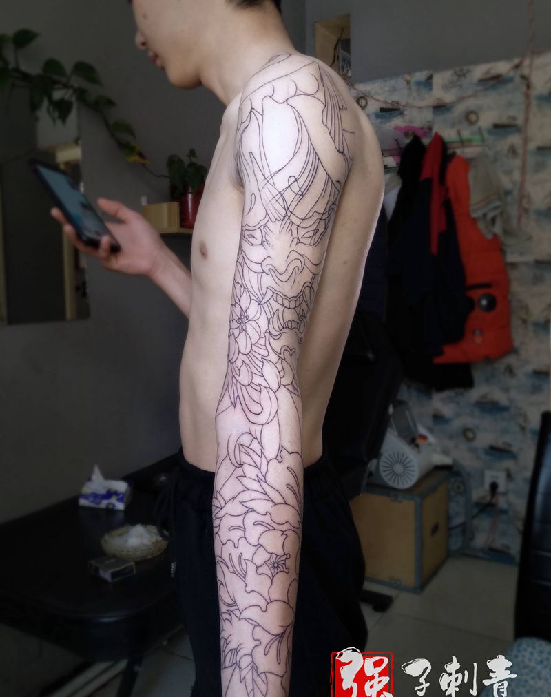 般若、牡丹、菊花纹身图片_手臂老传统花臂纹身图案