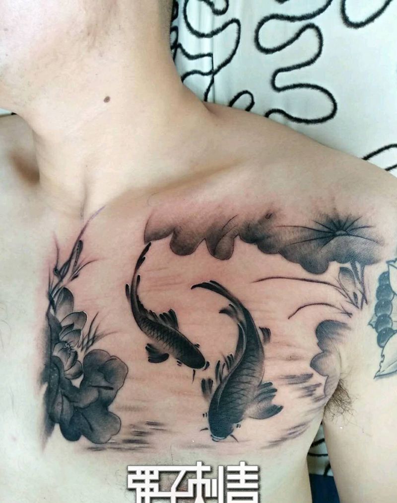 水墨《如鱼得水》纹身图片_胸部水墨纹身图案