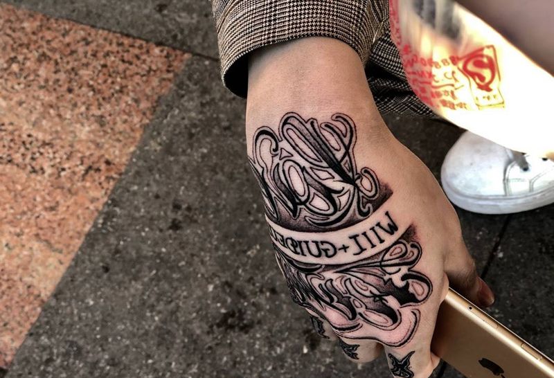 当前位置: 首页 >河北省承德市纹身店-成尧TATTOO纹身图案>花手:花体字纹身图片_手部花体字纹身图案