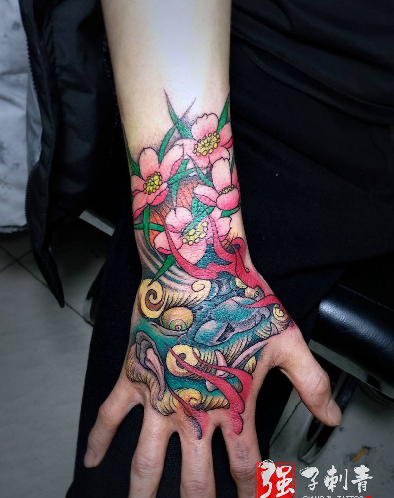 当前位置: 首页 >河北省张家口市纹身店-强子刺青纹身图案>唐狮花手背纹身图片_手部新传统纹身图案