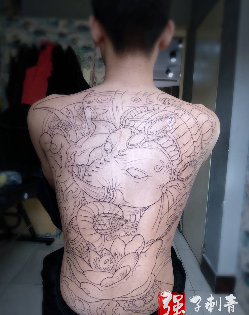 当前位置: 首页 >河北省张家口市纹身店-强子刺青纹身图案>满背《象神》线条纹身图片_背部新传统割线纹身图案