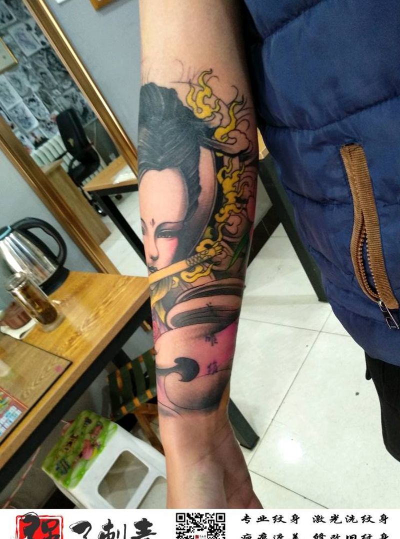 当前位置: 首页 >河北省张家口市纹身店-强子刺青纹身图案>彩色艺伎包小臂纹身图片_手臂新传统纹身图案