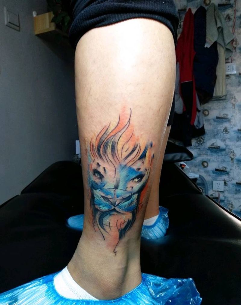 水彩风格《狮子》纹身图片_腿部水彩纹身图案
