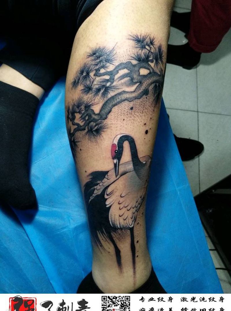 水墨《松鹤延年》纹身图片_腿部水墨纹身图案