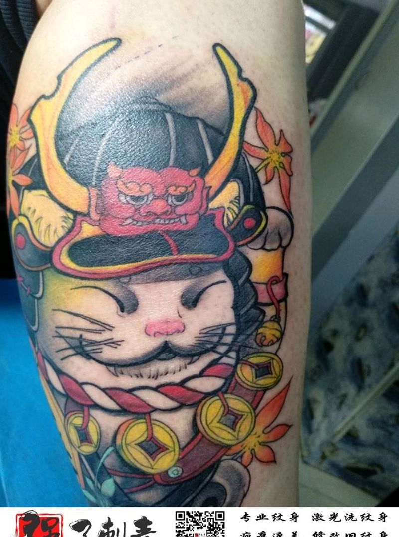 招财猫纹身图片_腿部New School纹身图案