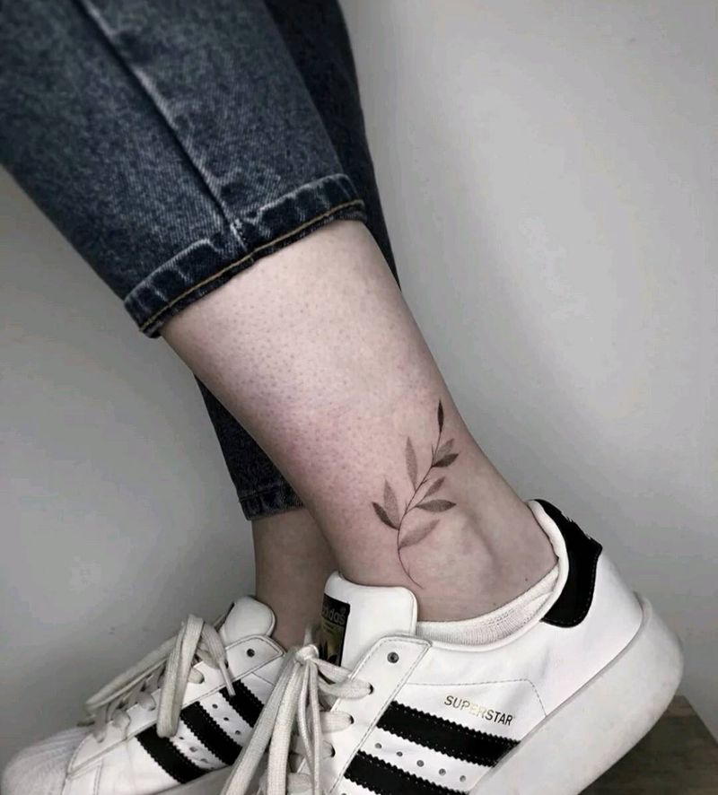 脚踝小清新《枝叶》纹身图片_腿部点刺纹身图案