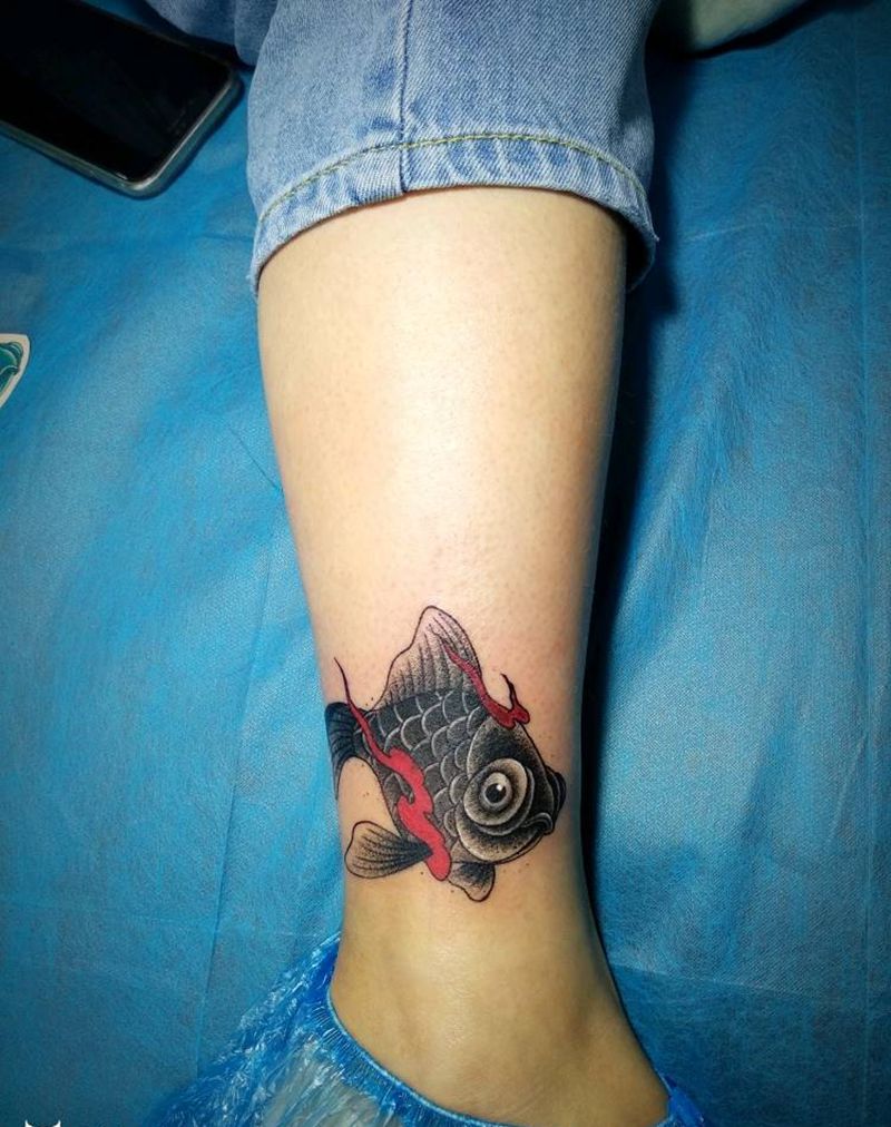 点刺《金鱼》遮盖英文字母纹身图片_腿部点刺纹身图案