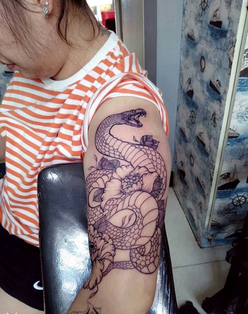 蟒蛇与牡丹纹身图片_手臂新传统素花纹身图案