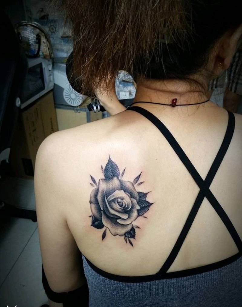 玫瑰花纹身图片_肩部新传统素描纹身图案