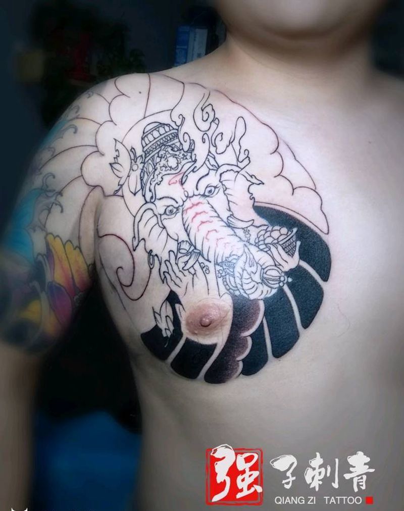 象神纹身图片_胸部老传统半胛象神纹身图案