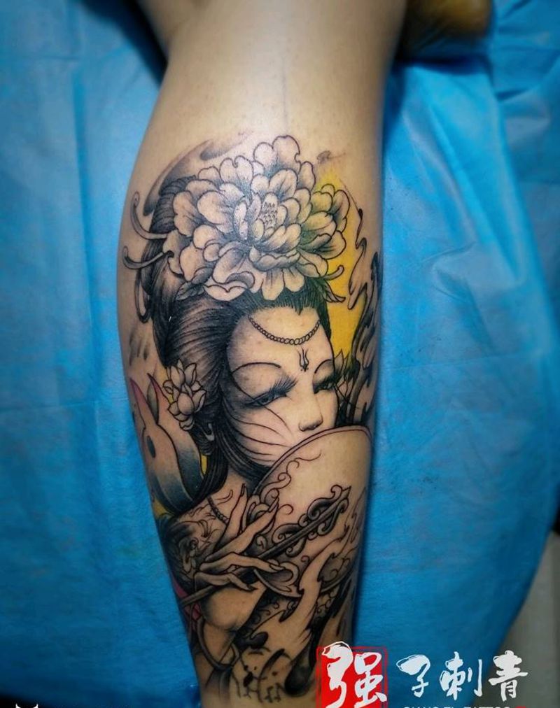 小腿外侧艺伎纹身图片_腿部新传统艺伎纹身图案