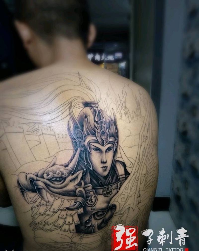 满背赵云打雾进度纹身图片_背部新传统赵子龙打雾纹身图案