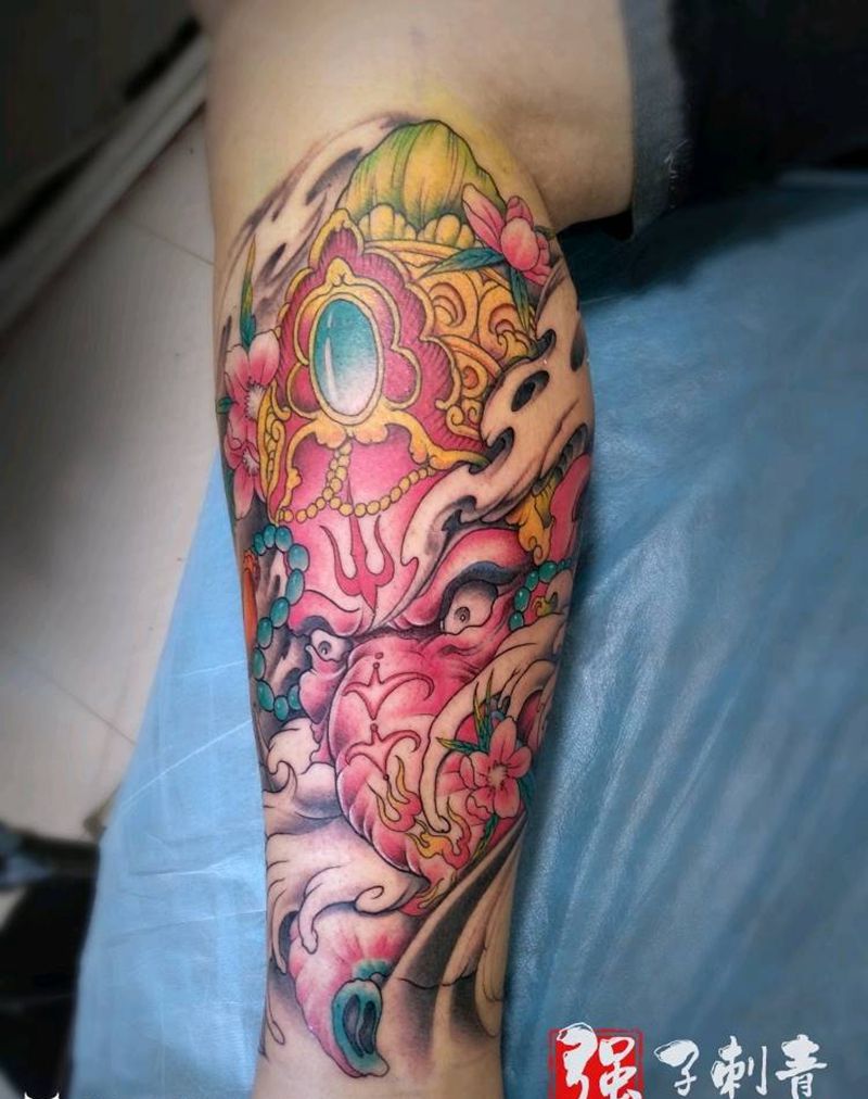 当前位置: 首页 >河北省张家口市纹身店-强子刺青纹身图案>彩色象神纹身图片_腿部新传统纹身图案
