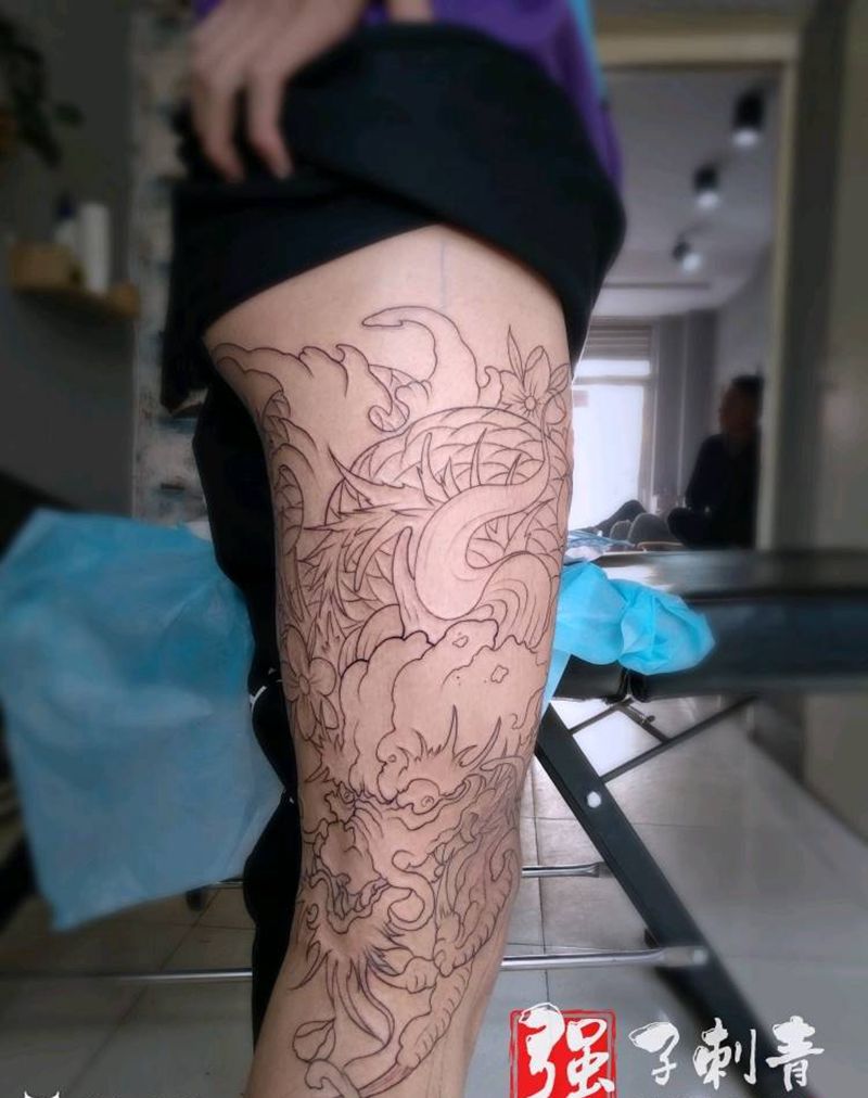 大腿龙线条纹身图片_腿部新传统割线纹身图案