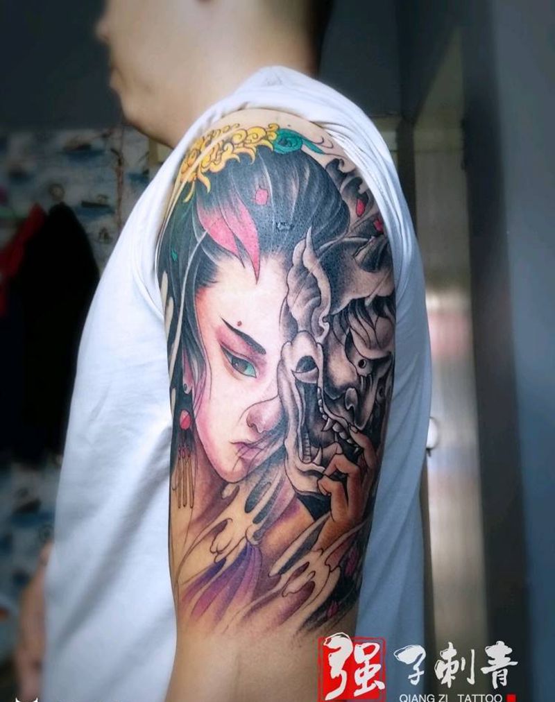 当前位置: 首页 >河北省张家口市纹身店-强子刺青纹身图案>彩色般若艺伎纹身图片_手臂新传统纹身图案