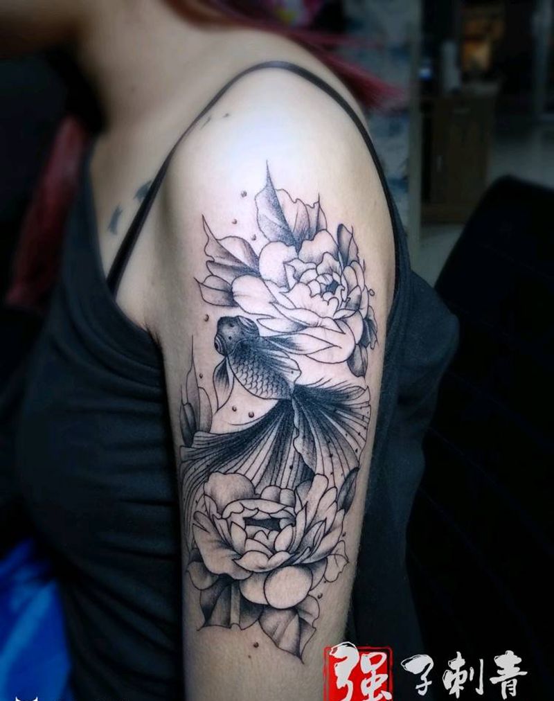 小金鱼素花纹身图片_手臂新传统纹身图案