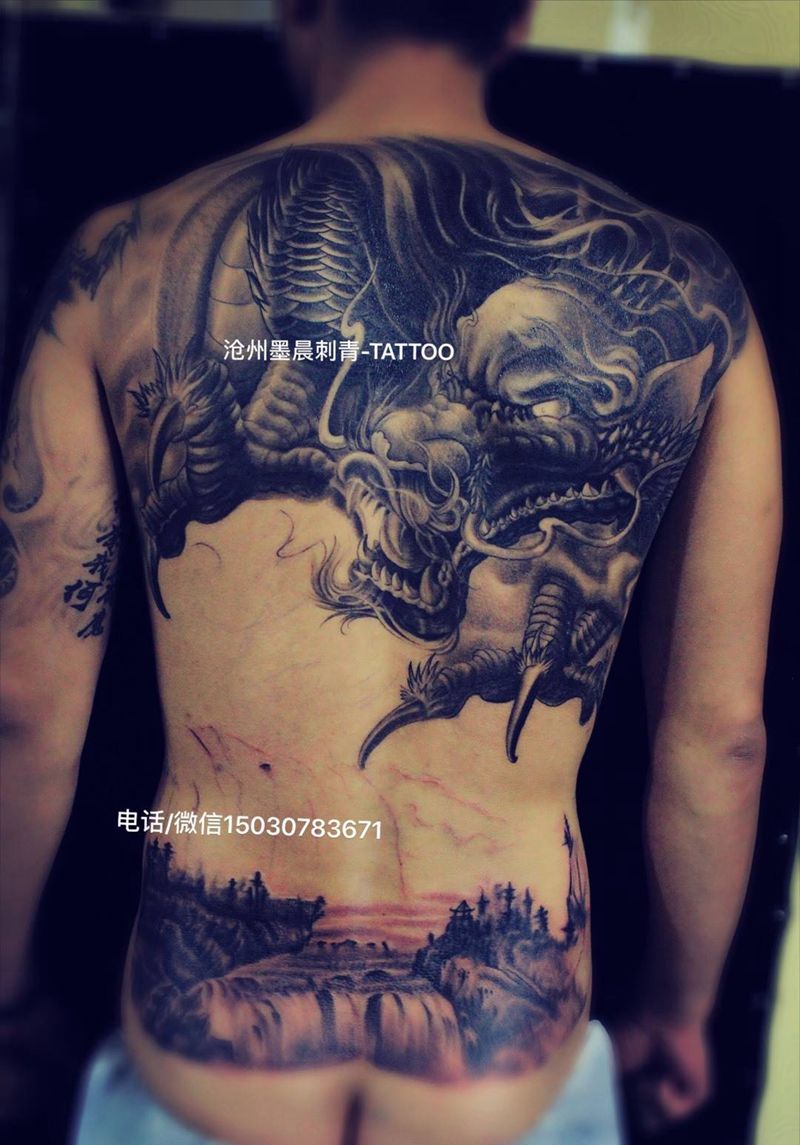 当前位置: 首页 >河北省沧州市纹身店-沧州墨晨刺青纹身图案>满背山水龙纹身图片