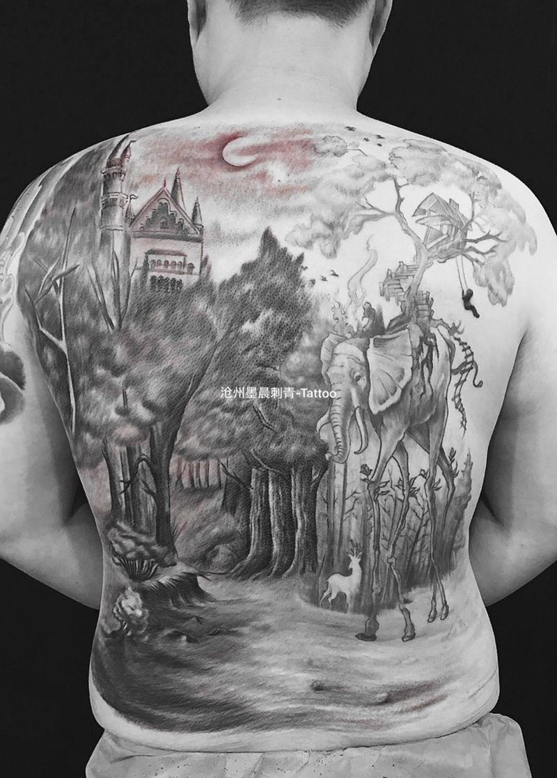 当前位置: 首页 >河北省沧州市纹身店-沧州墨晨刺青纹身图案>森林古堡纹身图片