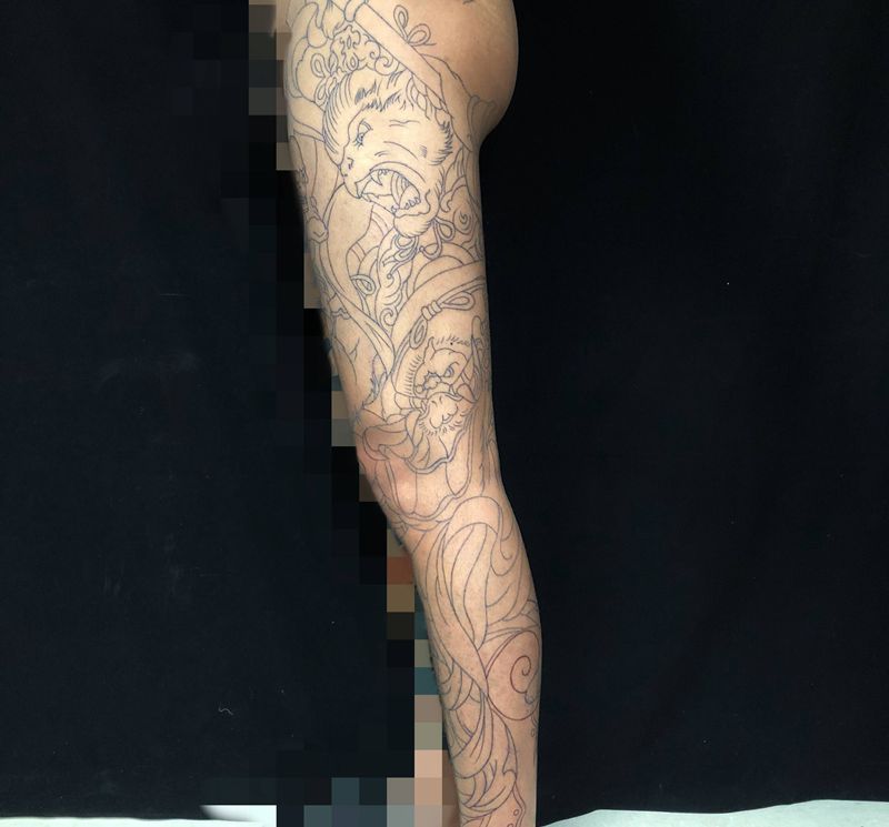 • T网红王老大花腿龙纹身图片_腿部新传统纹身图案