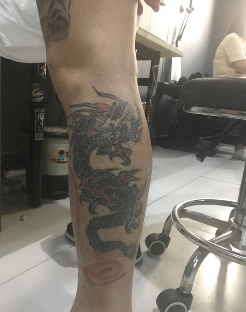 • T网红王老大花腿龙纹身图片_腿部新传统纹身图案